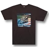 This black t-shirt celebrates the classic 1969 movie 'Easy Rider.' It is printed with the 'Freedom' design of the bikers on the American Flag on the front. Easy Rider is a road movie written by Peter Fonda, Dennis Hopper, and Terry Southern. It was produced by Fonda and directed by Hopper. It tells the story of two bikers traveling through the American Southwest and South trying to achieve freedom. The classic film was added to the Library of Congress National Registry in 1998. Celebrate the movie 'Easy Rider', with this awesome shirt. Read more